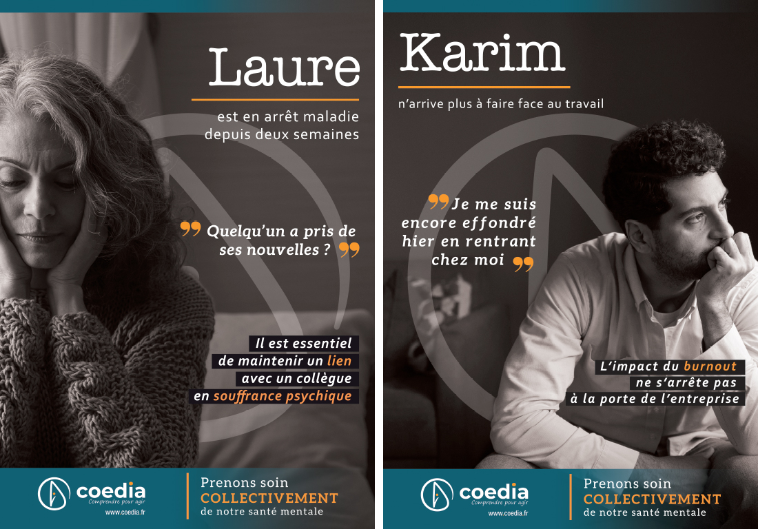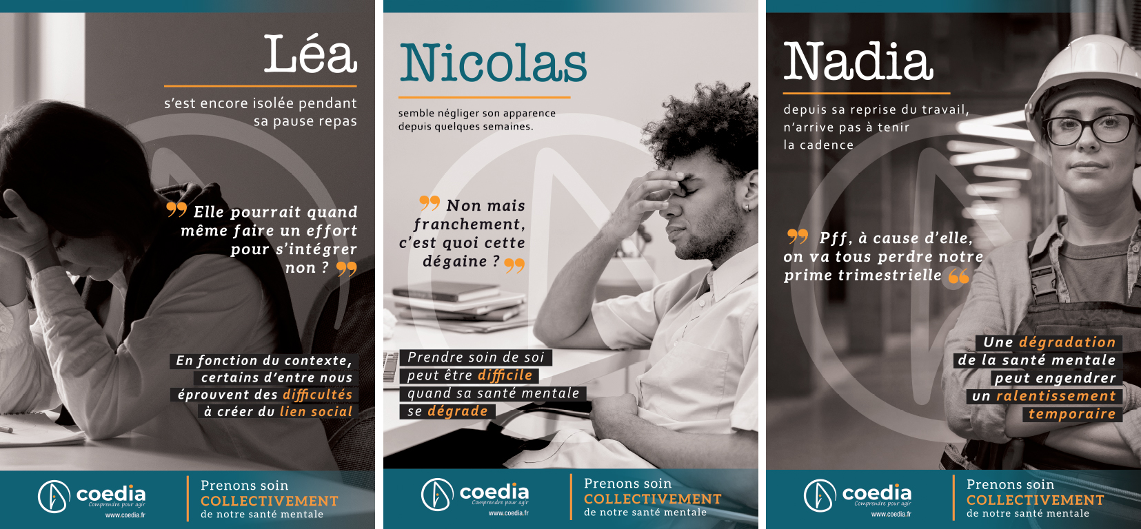 Retrouvez nos 5 affiches permettant de réaliser une campagne d'affichage pour sensibiliser sur les impacts d'une santé mentale dégradée en emploi.